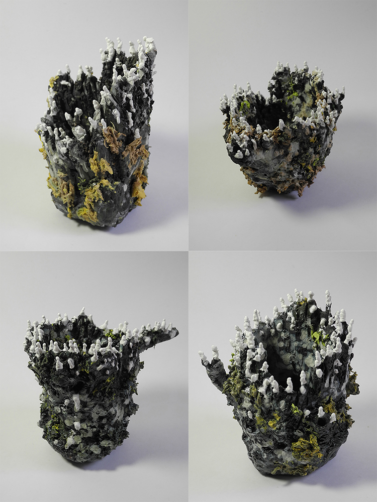 Josiane Keller “tree bark cups – set of four” stoneware, underglaze, glaze, dimensions: various, between 4.5” x 3” x 3.5” (2019)